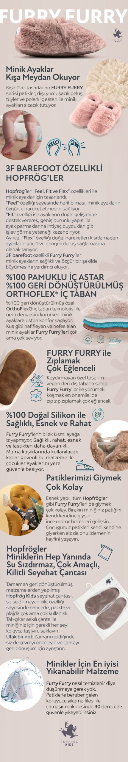 Είναι διασκεδαστικό να περπατούν, να τρέχουν και κυρίως να χοροπηδούν με τα Furry Furry, τα οποία είναι ειδικά αντιολισθητικά κατασκευασμένα με σόλα από συνθετικό vegan δέρμα.