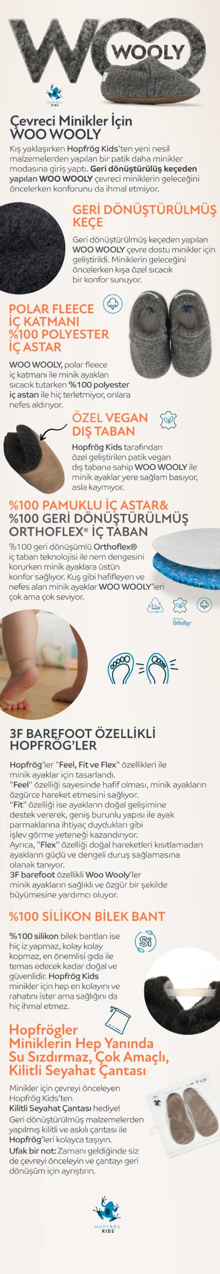 Τα WOO WOOLY είναι κατασκευασμένα από ανακυκλωμένο τσόχινο ύφασμα και είναι ιδανικά για μικρά οικολογικά ποδαράκια. Προστατεύουν το περιβάλλον και κρατούν ζεστά τα παιδικά ποδαράκια τις κρύες μέρες του χειμώνα.