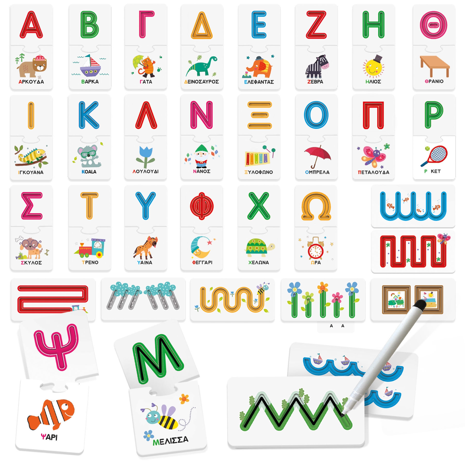 Μάθε την αλφάβητο, διάβασε τις λέξεις και γράψε τα γράμματα με τον μαρκαδόρο που σβήνει!