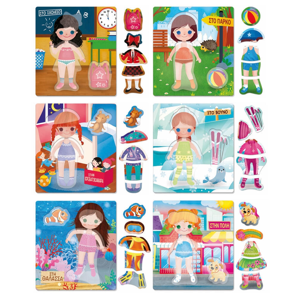 Το επιτραπέζιο παιχνίδι διαθέτει 6 κούκλες από χαρτόνι με διαφορετικά κοπτικά ώστε να μάθουν τα παιδιά να ξεχωρίζουν τα ρούχα σε διαφορετικές περιστάσεις.