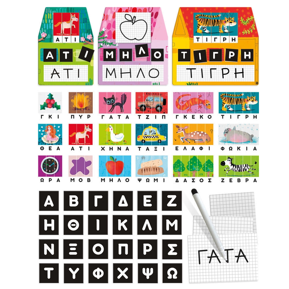 Τα παιδιά τοποθετούν τα γράμματα το ένα δίπλα στο άλλο στα σπιτάκια και γράφουν τα γράμματα σε γραμμές με τον ειδικό μαρκαδόρο. Το παιχνίδι είναι εμπνευσμένο από τη μέθοδο Μοντεσσόρι των 3 σταδίων και ενισχύει την εκμάθηση της ανάγνωσης και της γραφής με διασκεδαστικό τόπο!