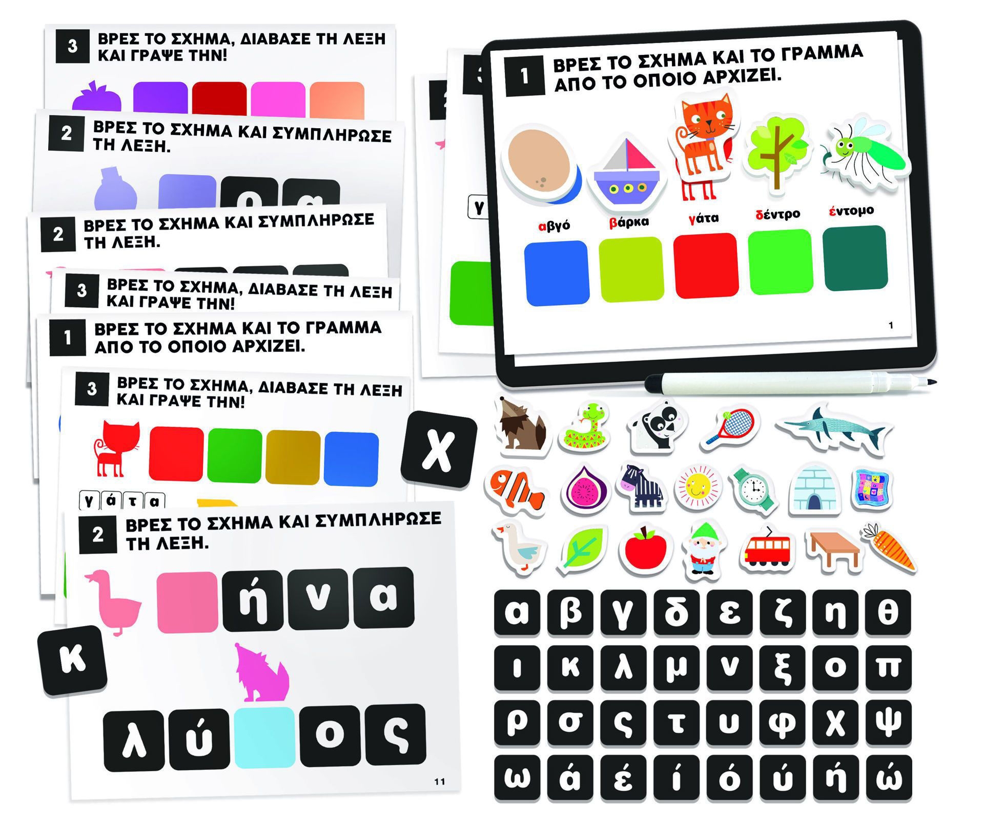Περιέχει πολλές ασκήσεις με γράμματα και σχήματα μαγνήτες.