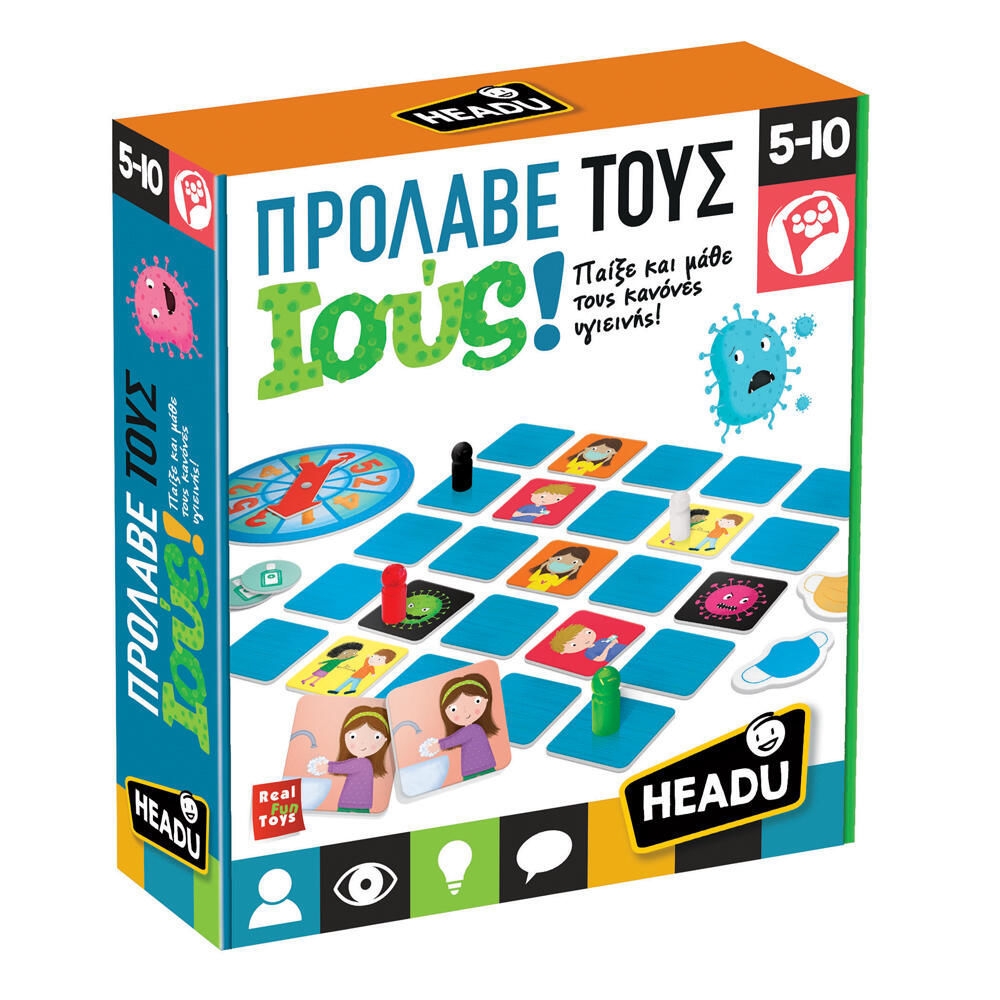 Παίξε και μάθε τους κανόνες υγιεινής! Ένα διασκεδαστικό παιχνίδι συνεργασίας, παρατήρησης, μνήμης και στρατηγικής, αφιερωμένο στους κανόνες συμπεριφοράς πουπρέπει να τηρούμε για τον περιορισμό της μετάδοσης των ιών. Παίζουμε όλοι μαζί με στόχο να προστατεύσουμε το σύνολο... αλλά προσοχή στις κάρτες των ιών!