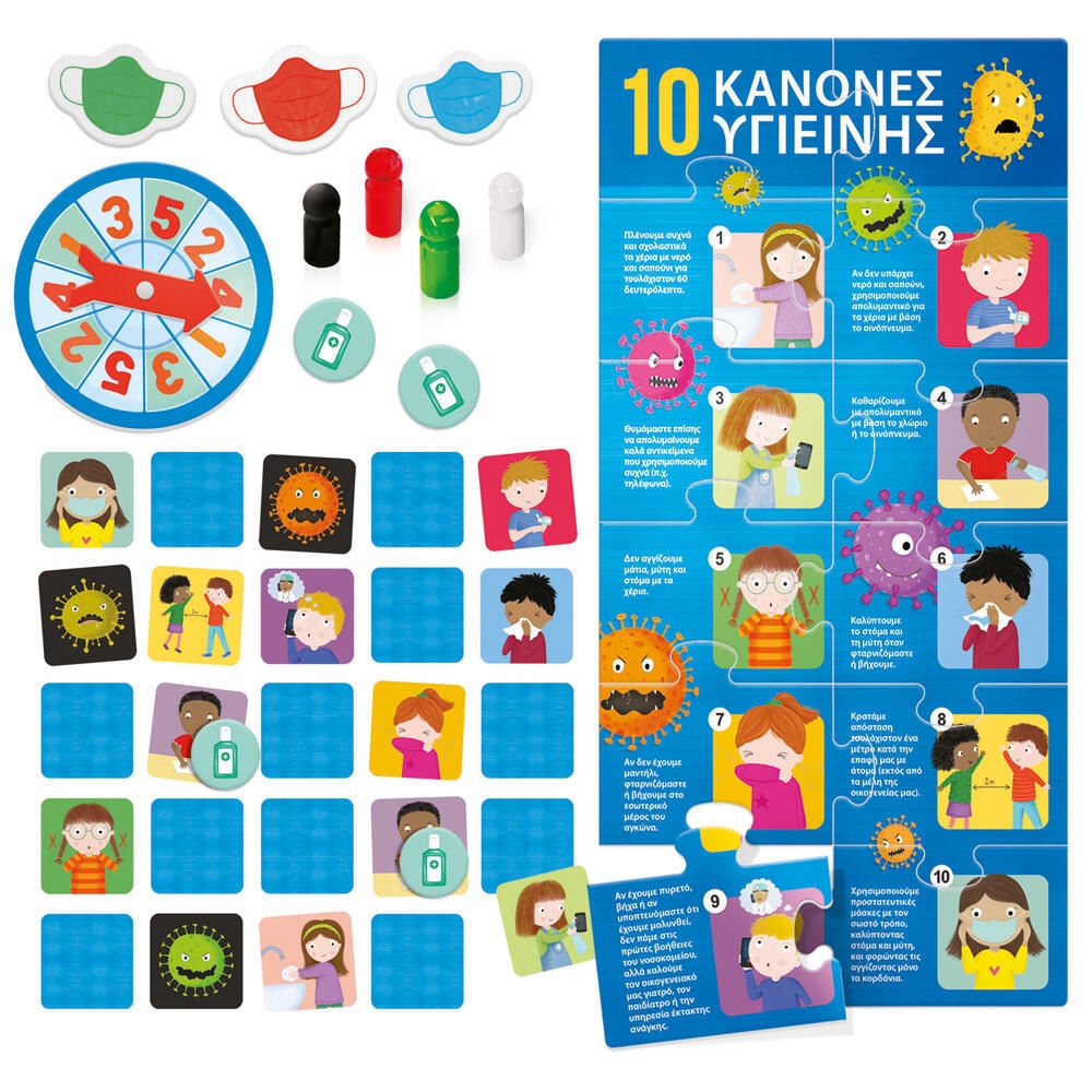 20 κάρτες συμπεριφοράς • 5 κάρτες ιών • 1 τροχός • 4 πιόνια• 8 κάρτες μάσκας • 24 μάρκες υγιεινής • 1 παζλ κανόνων υγιεινής • Οδηγίες