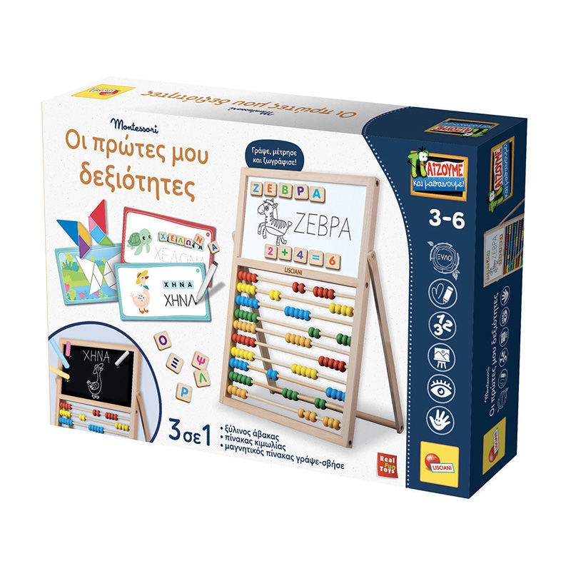 Ξύλινος άβακας 3 σε 1 με πίνακα, γράμματα & αριθμούς. Εκπαιδευτικό παιχνίδι Lisciani για παιδιά 3-6 ετών.