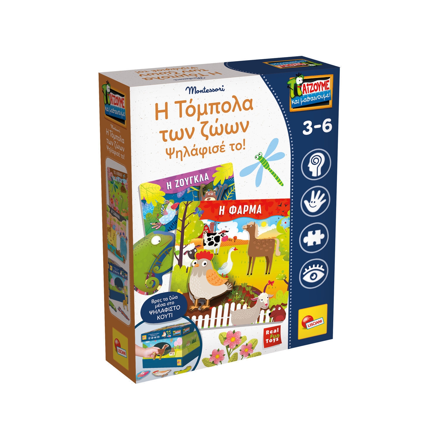 Επιτραπέζιο Montessori Lisciani με ψηλαφιστό κουτί. Εκπαιδευτικό παιχνίδι για παιδιά 3-6 ετών με 6 κάρτες ζώων.