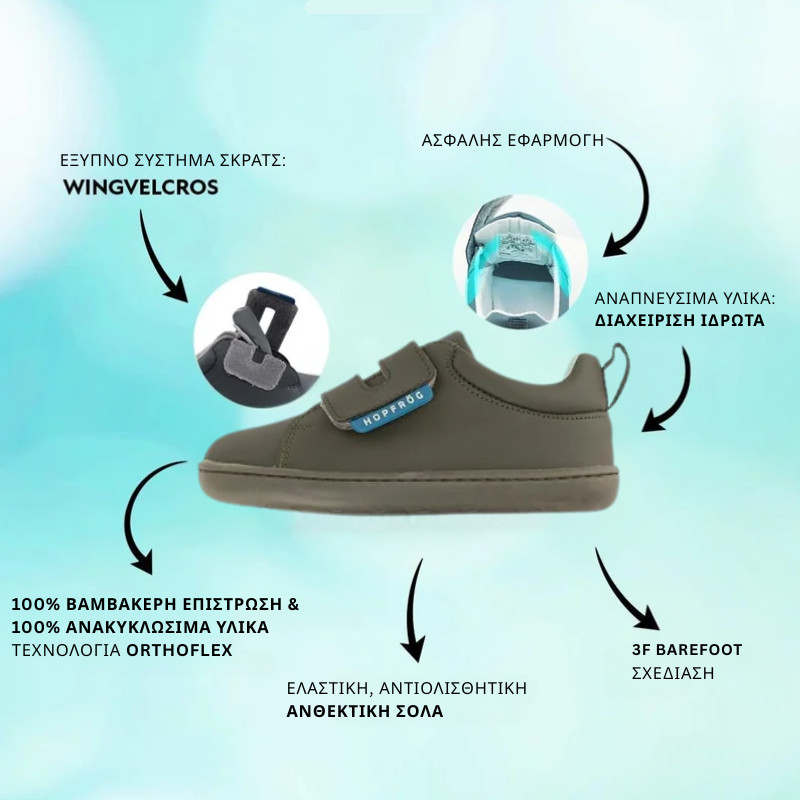 Τα Casual κατασκευάζονται από οικολογικά και ανακυκλωμένα υλικά, χωρίς χρήση ζωικών προϊόντων. Η Hopfrög Kids προάγει τη βιωσιμότητα, φροντίζοντας τα παιδιά, το περιβάλλον και τα ζώα.